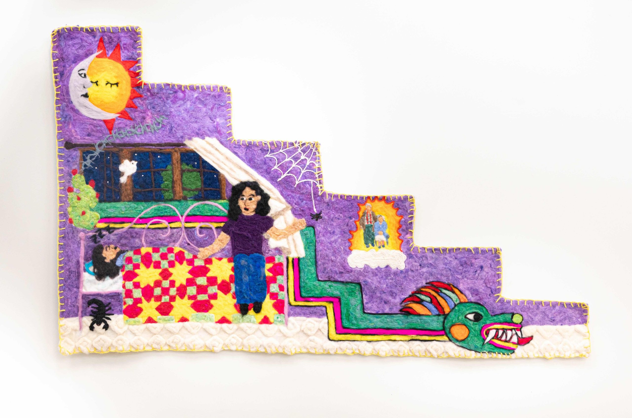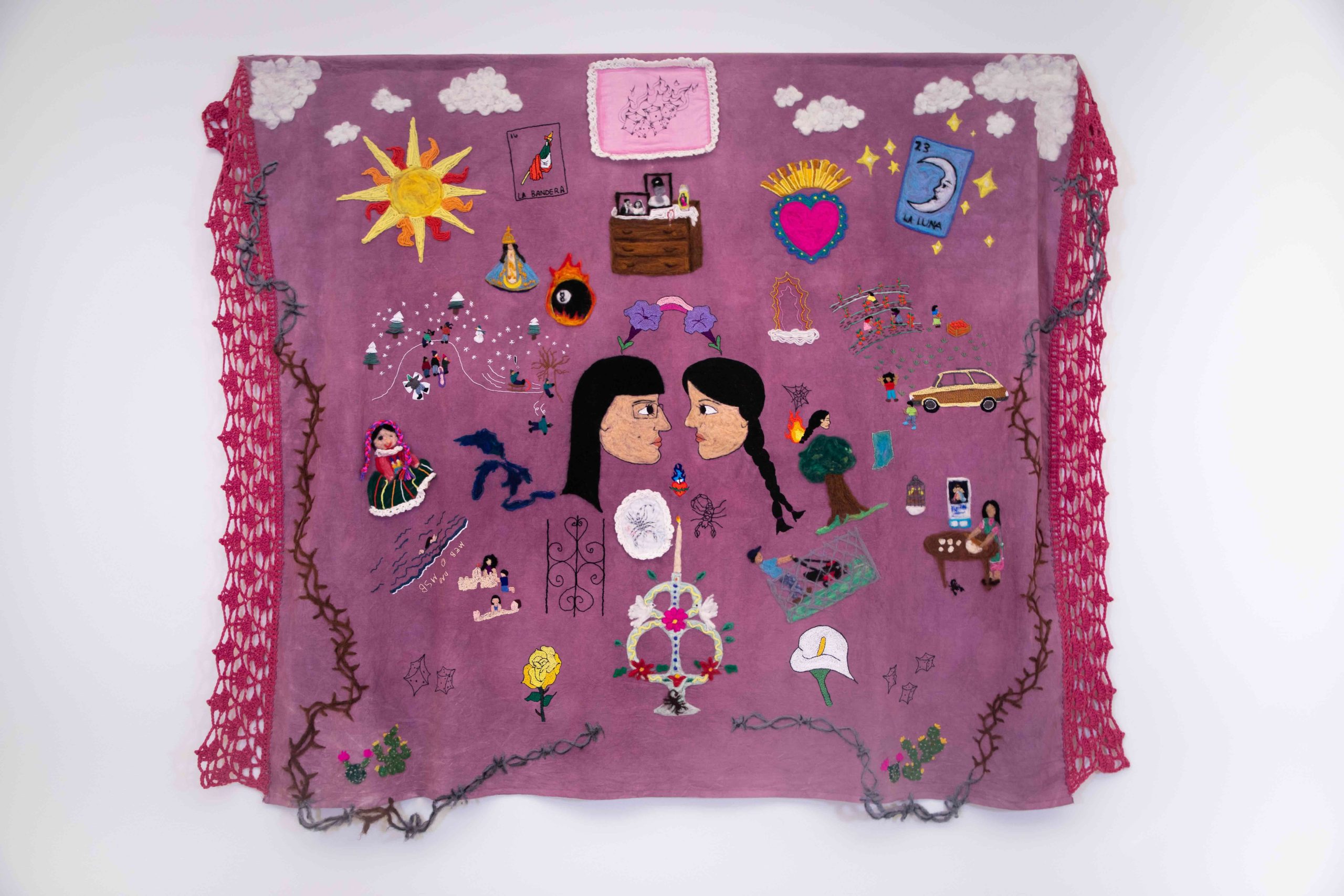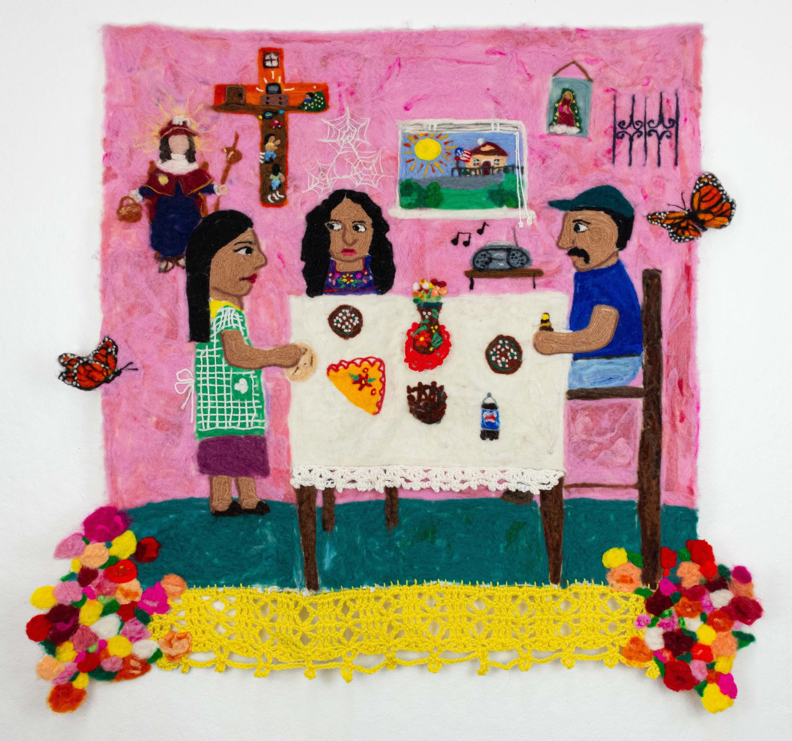 Meli Bandera (they/them) is a Chicana multi-disciplinary artist, curator, and educator based in the Midwest. They are from South Bend, IN. Their work focuses on the interaction of ancestral fiber techniques and contemporary practices, such as Chicano Tattoo traditions to investigate cultural shifts and the effect migration and place contribute to a cultural identity. Through black and gray linework, bold saturated color, and story driven narrative, Meli explores Mexican and Catholic histories, and family legacy. They hold a BFA in Drawing and Painting from Indiana University South Bend and an MFA in Fiber from Cranbrook Academy of Art. Meli is currently the Associate Curator at the Krasl Art Center.