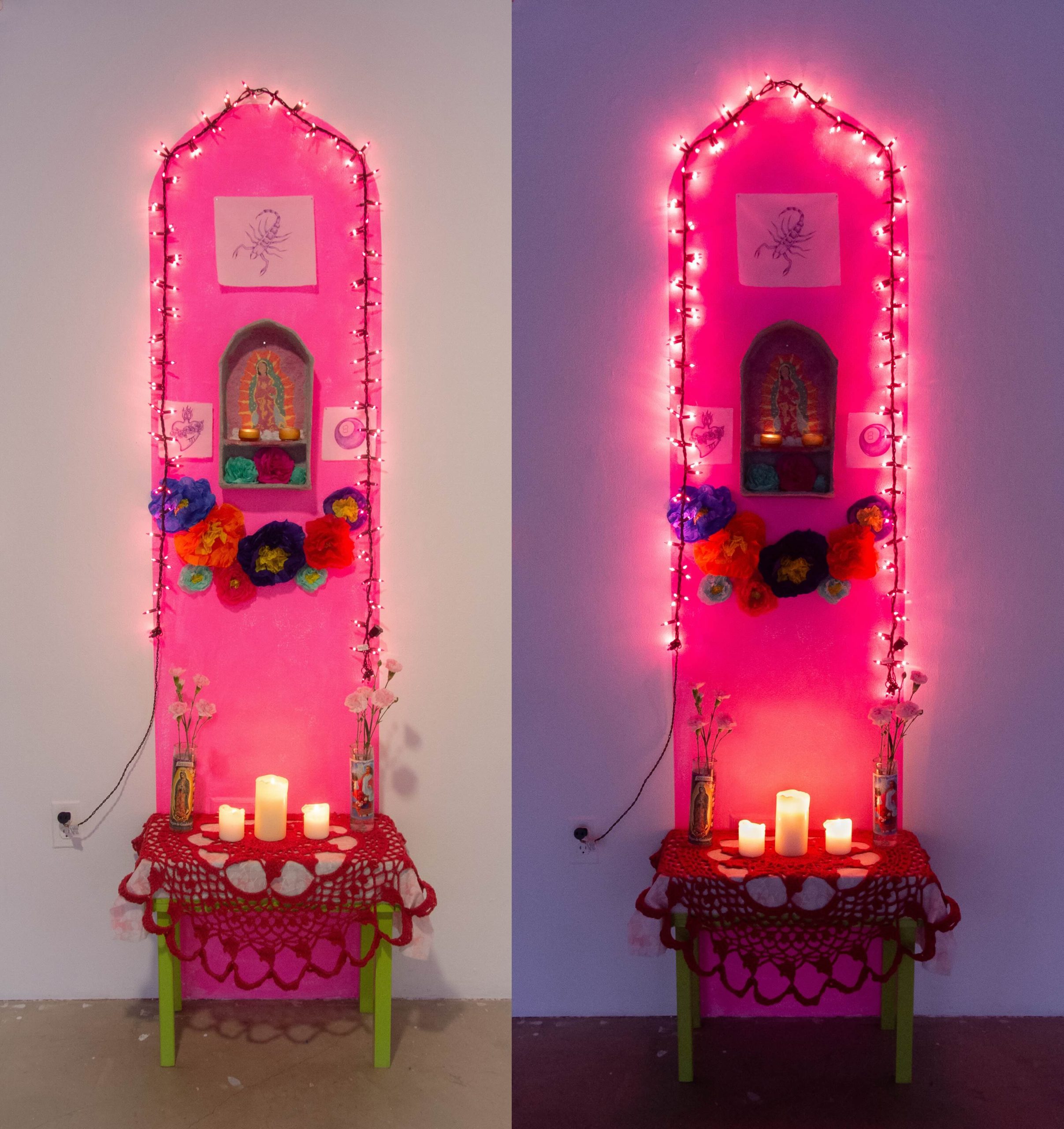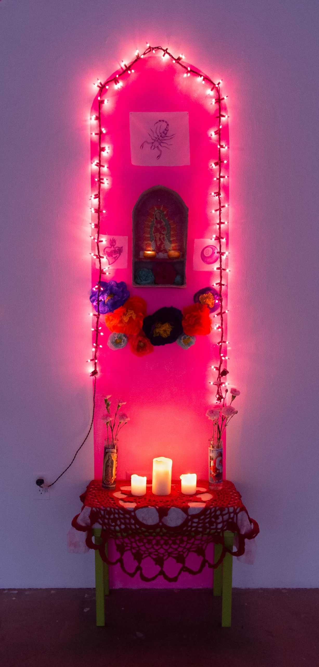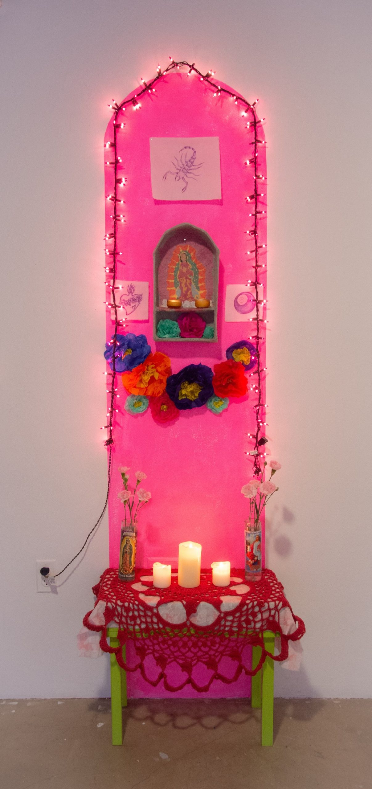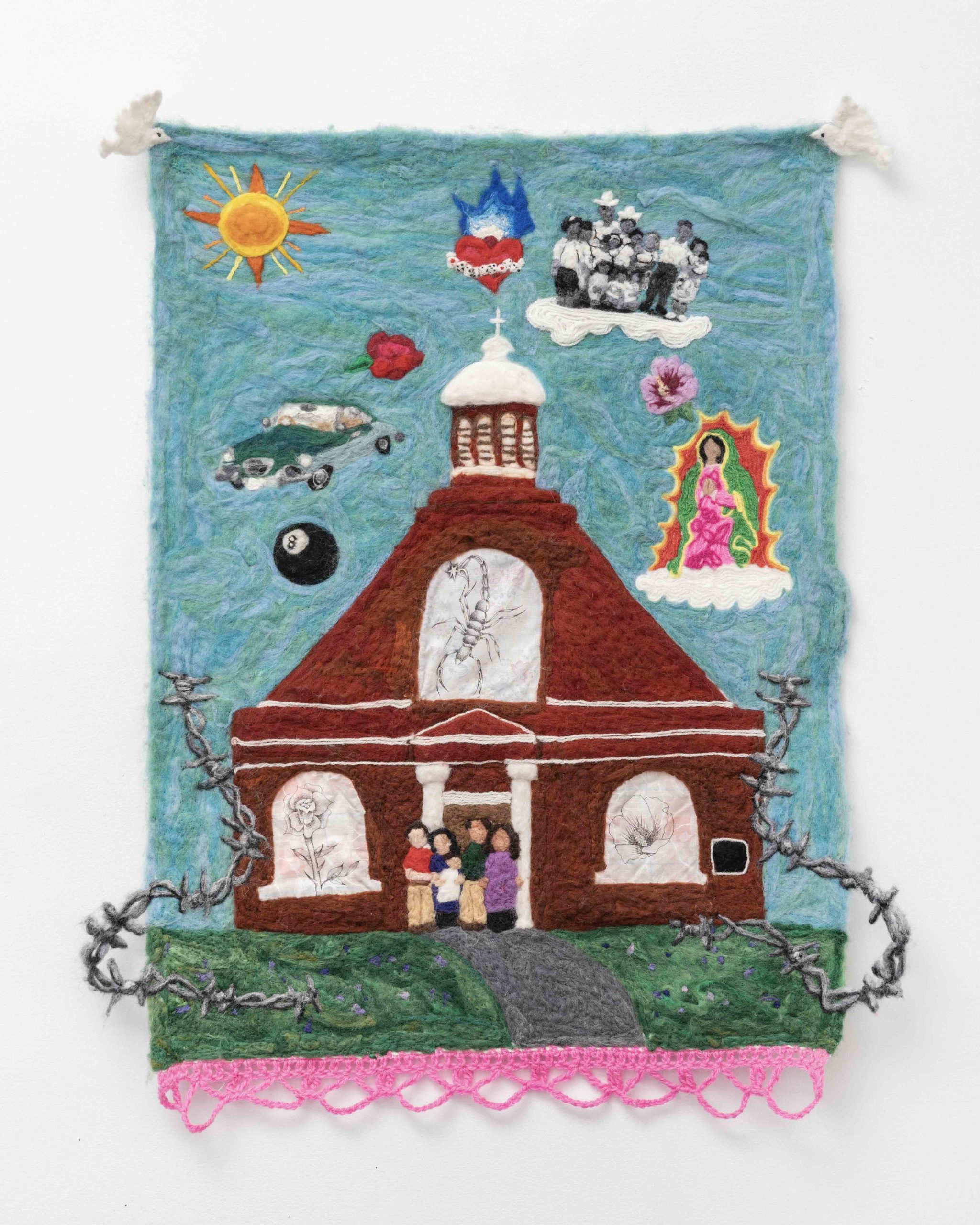 Meli Bandera (they/them) is a Chicana multi-disciplinary artist, curator, and educator based in the Midwest. They are from South Bend, IN. Their work focuses on the interaction of ancestral fiber techniques and contemporary practices, such as Chicano Tattoo traditions to investigate cultural shifts and the effect migration and place contribute to a cultural identity. Through black and gray linework, bold saturated color, and story driven narrative, Meli explores Mexican and Catholic histories, and family legacy. They hold a BFA in Drawing and Painting from Indiana University South Bend and an MFA in Fiber from Cranbrook Academy of Art. Meli is currently the Associate Curator at the Krasl Art Center.
