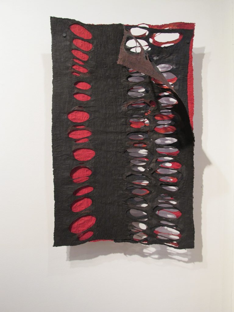 At the Minnesota Center for Book Arts Jiyoung Chung exhibited exhibited a show titled Whisper: Jiyoung Chung’s Joomchi. The work in paper explored the Korean process of Joomchi, which seems to be half paper making and half felting. Jiyoung Chung used this process to create vivid and delicate pieces. My favorite pieces incorporated black and red pieces in several layers and explored the relationship between humans and the devine. Whisper Romance II-XXXI has a layer peeling back to expose what’s underneath—a concept that I have been returned to throughout the day.