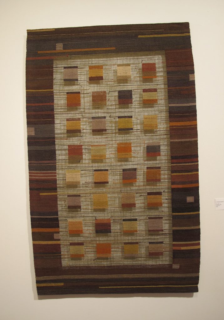 At the Traffic Zone Center for Art I met Morgan Clifford who was presenting her exhibit “Checks, Nets and Woven Grids”. She was kind and open about her process and work in a variety of uncommon threads and paper from Habu which she dyes herself before weaving. The work in “Checks, Nets and Woven Grids” explores a healthy balance between open net like structures and positive space in the form of checks and squares. When speaking of her work Morgan Clifford explained her fascination with long weft floats which appear on the surface of her checks. We also engaged in a chat with Patricia Malarcher about the close relationship between a fiber artist and their materials, of which Clifford’s work is an outstanding exemplar.