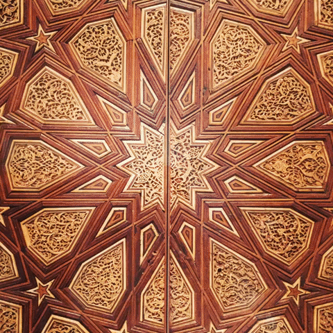 Images: Islamic carved wooden panel, early 9th century. // Chair with porcupine quillwork panels, Nova Scotia, Mi’kmaq, mid-19th century. // Daniel Pabst Cabinet circa 1875, carved Renaissance revival style. // Christy Oates Kaleidoscope Algorithm 2012, fifteen segments of various woods. // Carved wooden panel from Iraq, Abbasid period, early 9th century.