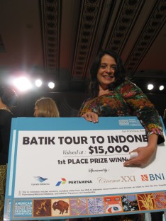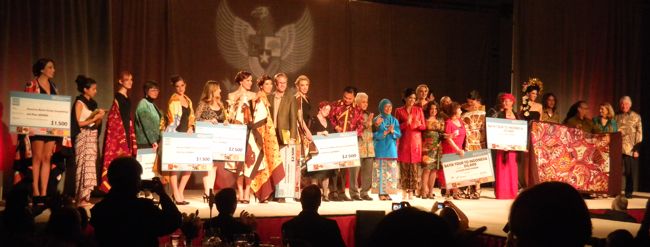Finalist celebration in San Francisco: In November 2011, 9 finalists were invited to a “big reveal” at a lavish gala banquet at the Palace Hotel hosted by Ambassador Djalal and his wife Ibu Rosa Rai Djalal. Honorary judges Ibu Djalal and Ibu Okke, wife of banquet Guest of Honor Minister Hatta Rajasa, joined the established panel of judges who were all flown to San Francisco to confer and choose which designs would win the top prizes, this time by evaluating each as a design “materialized” on 3 meters of cotton.