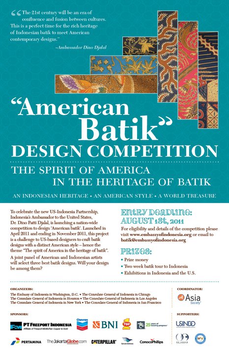 In early summer 2011, I found out (through the International Textile & Apparel Association) about a batik design competition called American Batik Design Competition (ABDC) sponsored by the Indonesian Embassy in Washington, DC. To celebrate the new US-Indonesia partnership, the Republic of Indonesia’s Ambassador to the US launched a nation-wide contest to design ‘American batik’. It offered an unprecedented opportunity to create, innovate – and maybe even win a trip to Indonesia.