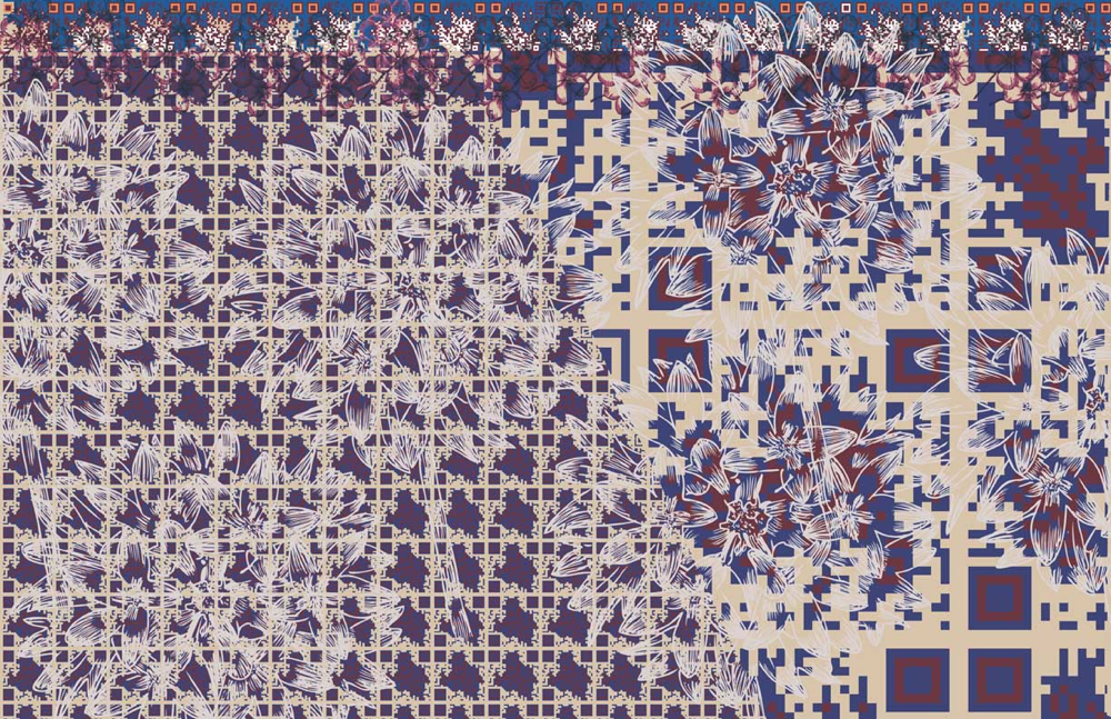 In that spirit, I adapted a very contemporary American symbol, the QR (Quick Response) code, into a textile design. A QR code consists of black and white squares arranged within a larger square frame that can be read by a smart phone. It is a prevalent marketing tool, having been integrated into both traditional and interactive campaigns. QR codes are free and are being used to interpret natural and historical points of interest on nature trails and walking tours by adding to or replacing expensive signs.
