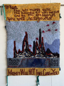 In art classes, the readings gave me license to question this new reality. Why am I doing this? What is art for, anyway? I found inspiration in protest posters from the environmental movement of the 1970s. Works on subversive stitching and activism sparked little fires. The three main firestarters were: The Subversive Stitch: Embroidery and the Making of the Feminine by Rozsika Parker, Crafting Dissent: Handicraft as Protest from the American Revolution to the Pussyhats, edited by Hinda Mandell, and Fray by Julia Bryan-Wilson. In these, I found support I didn’t know existed for the frustration I was feeling. I began to express this frustration in the pieces I made. For the first time, I felt able to move from the silence and invisibility that traditionally inhabits feminism, hooked art, and nursing to voice my concerns about US healthcare and to advocate for vulnerable students who are rising into nursing education.