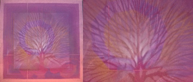 Along with that first shipment came an instruction and inventory sheet. Being short on change (a euphemism for being a starving artist) I was frugal in my application in my initial essays, only to be surprised that I could stretch the dye over large surfaces by diluting it with water. Of course as this thinned-out dye solution developed, it was much lighter in color. However, since I wanted to interlace multiple images at different layers, by using the same diluted solution numerous times (depending on the intensity I was seeking) I eventually arrived at the full strength of the vibrant color which carried along my visual thoughts – not just on the surface but penetrating deeply into the core of the fabric.