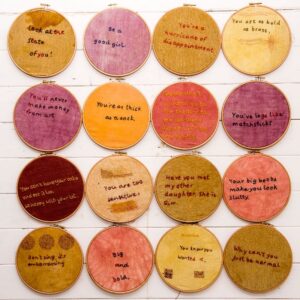 From 2018 to 2020, Violet worked on The Repair Project combining environmental and emotional repair. “The public submitted hurtful statements which were said to them in their formative years that impacted on them, and I offered to embroider these statements in the hope of releasing them from their harmful effects,” she elaborated. Violet ended up embroidering over 100 pieces, some of which she did while installed in a gallery so members of the public could watch. An important component of this project was that she used naturally dyed vintage cloth.