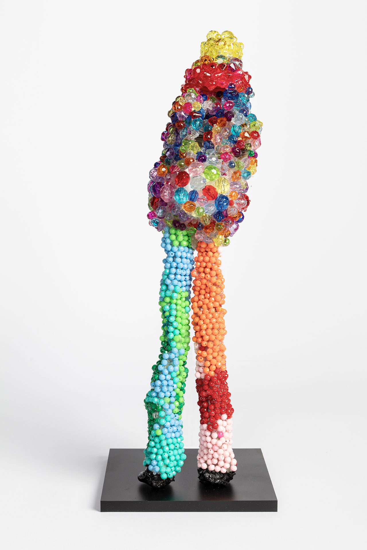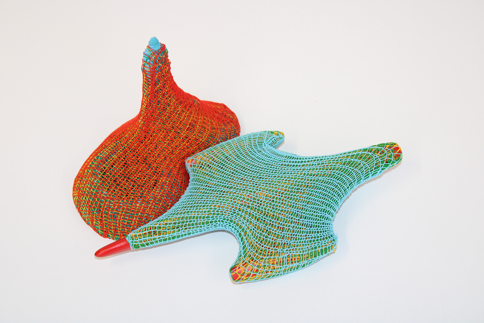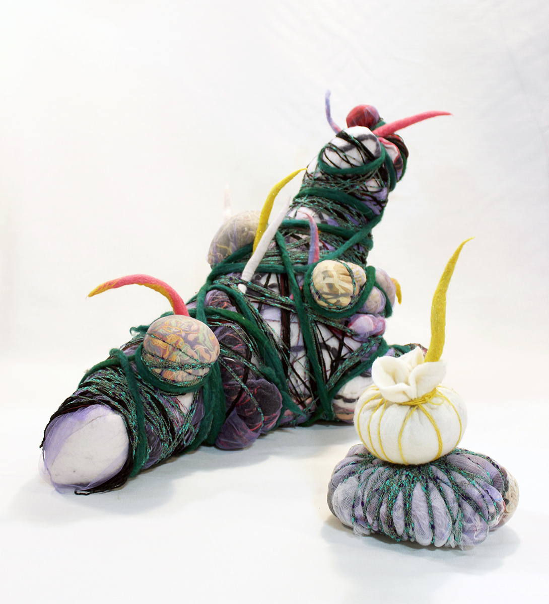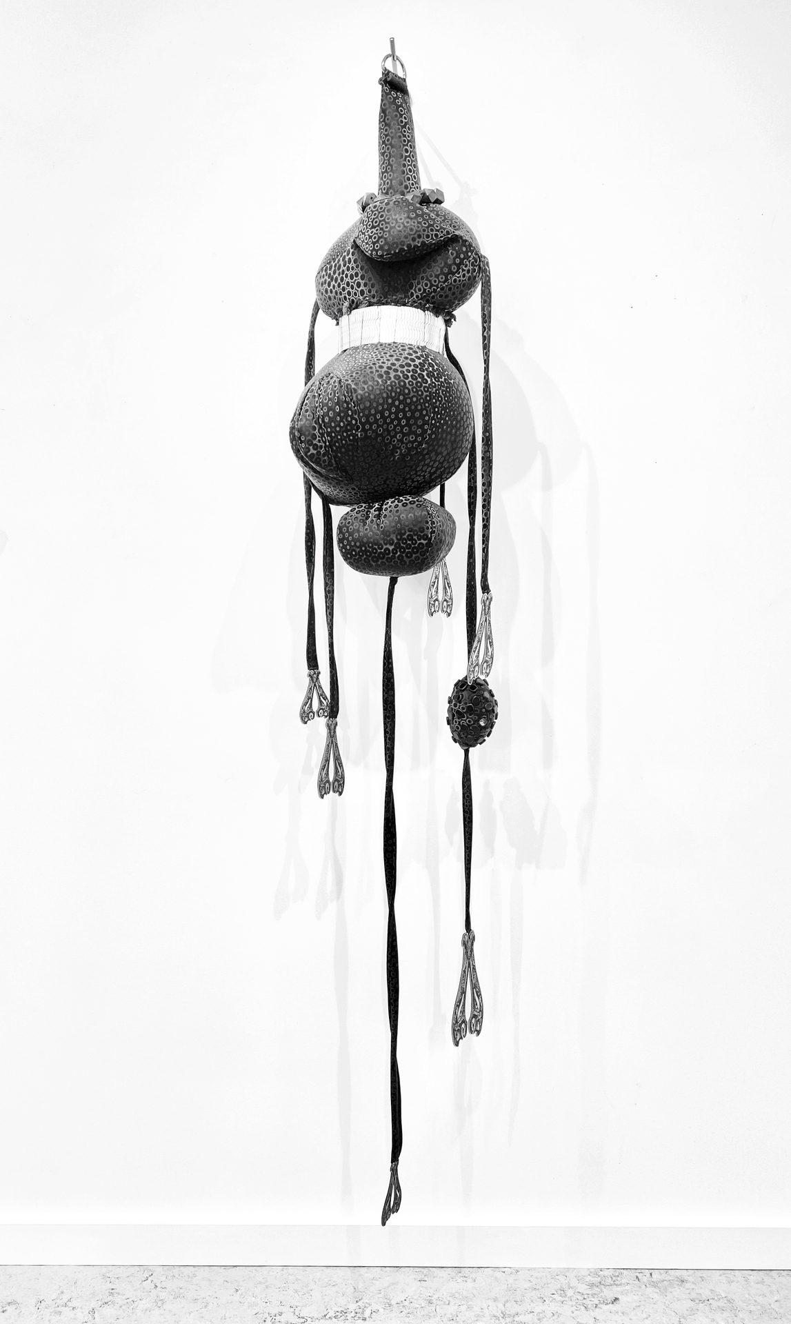 Ivy Anderson, An Unlikely Pair, 2024. Found objects, acrylic, elastic [5.25" x 9.25" x 8.5"].