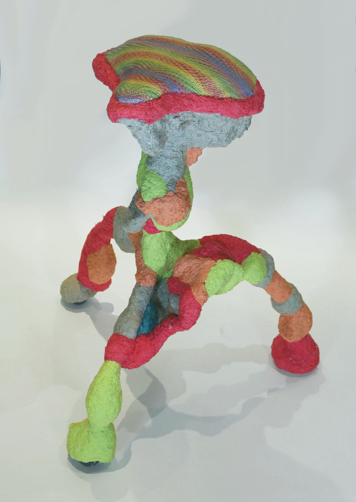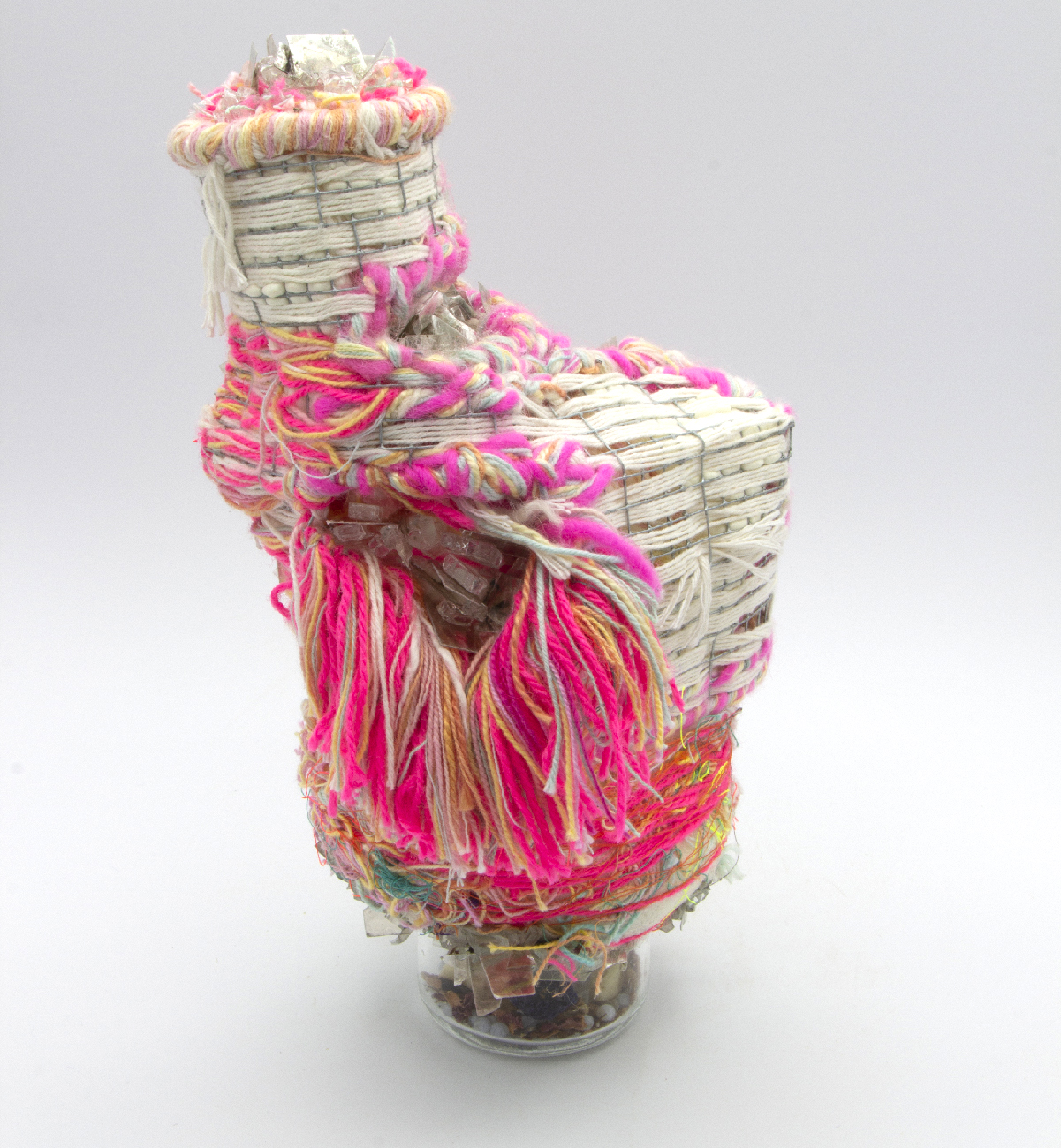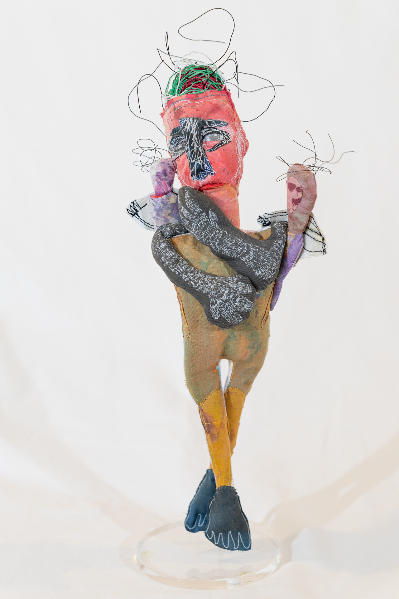 Ivy Anderson, An Unlikely Pair, 2024. Found objects, acrylic, elastic [5.25" x 9.25" x 8.5"].