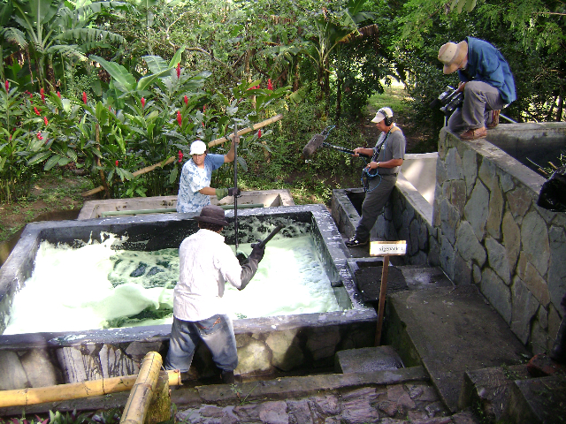 Over the next few days, we rose each morning before dawn and filmed the steps of the process as Cecilia made and nurtured the indigo vat. The wood fire under the vat was smoky and as the studio filled with smoke I squinted into the viewfinder through tears. The magic of indigo was palpable as the contents of the vat fermented and bubbled.