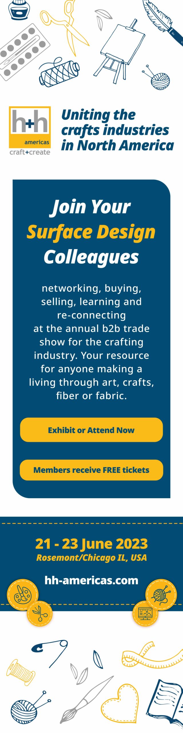 It will also be available at SDA Conference (Pop-Up Style) Bookstore during in•ter•face conference June 6-9, 2013, in San Antonio, Texas. Find out more about that event at www.surfacedesign.org/subpage/sda-conference-bookstore
