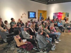 The meeting began with Pauline welcoming over 50 attendees to the Fiber Department. She spoke of the Art Institute’s long held relationship with SDA, some history of the organization, and her own personal history with SDA involvement, including career benefits and organizing past SDA conferences in Kansas City. Pauline introduced Jason Pollen, who had served as past KCAI Fiber Chair and SDA President for many years.