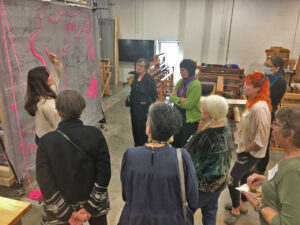 I recently received a Small Event Grant from SDA for this collaborative Kansas and Missouri meetup at the Kansas City Art Institute (co-sponsored by Missouri Fiber Artists) this past February. KCAI Fiber students were involved under direction of Fiber Chair Pauline Verbeek. We were exposed to a prominent BFA Fiber program plus a presentation and dialogue with two recent graduates of the program, Paulina Otero and Eva Llarena. Students also gave demonstrations on the innovative fiber techniques they’re experimenting with. Participants were also able to tour student studio spaces and converse with students individually about their work and experiences.