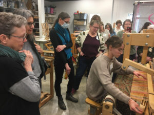 Annalee Hanson weaving demonstration at KCAI SDA MoFA meetup, 2023.