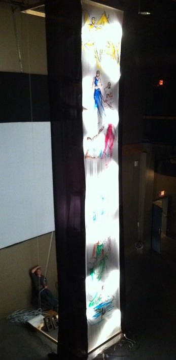 The audience cannot see me but they can see the dyes appear as they flow from my brush through the silk fibers. In about an hour, the entire thirty foot tower will look like a stained glass window filled with images of hope.