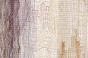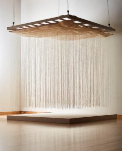 The presentation of Cloud Labyrinth, isolated and with ample room for contemplation, allows full appreciation of the work as an apotheosis of Tawney’s decades-long career. A study in contrasts, Cloud Labyrinth comprises thousands of individual, tiny threads suspended from a canvas panel or “ceiling.” Although composed in a strict square grid, the diaphanous work is yielding, responding to any atmospheric movement with a slight swaying. The piece was created in 1983 for the Lausanne International Tapestry Biennial in Switzerland, and has not been shown since 1999. Part of Tawney’s Cloud Series, which she began in the 1970s, the work will fill an entire gallery, occupying a space that is 16 feet high and 24 by 18 feet wide. The work exemplifies the evolution of Tawney’s practice into the complete dissolution of the loom while maintaining an unmistakable connection to weaving.