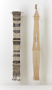 Lenore Tawney The Judge (left) 1961, linen; 124″ x 14″. The Bride (right) 1962, linen, feathers, 138″ x 13″. Courtesy of the Lenore G. Tawney Foundation, New York. Photo: Rich Maciejewski, 2018, courtesy of John Michael Kohler Arts Center.