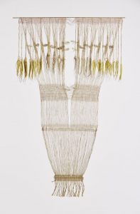 Lenore Tawney untitled (Lekythos) 1962, linen, silk, gold, feathers, 46 1/2″ x 29 1/4″. Collection of the Lenore G. Tawney Foundation, New York. Photo: Rich Maciejewski, courtesy of John Michael Kohler Arts Center.