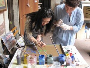 Cathy Pham learning ebru (marbling) with master instructor Ayla Makas at Caferaga Medresesi, Istanbul. Photo by Meredith Strauss