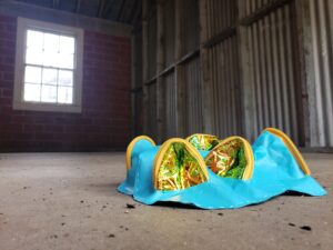 Korey Rowswell, Red Dirt Mourning, 2021. Quilters cotton installation, 3 x 3 x 3 feet.
