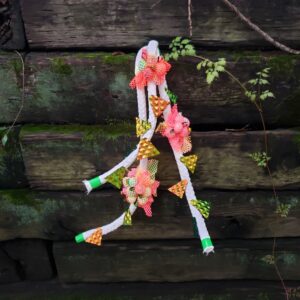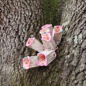 Invasive species are highly adaptive to different environments, even useful and beautiful in some contexts. I emphasize this beauty by using fabrics in bright colors with pleasing textures and sparkly finishes. Utility is communicated through the use of wire, metal elements or industrial fabrics. Pineapple Mike was created from a deconstructed pineapple themed lunch box. I intentionally incorporated the zippers as a nod to the boxes’ utility as well as beauty. Bringing these materials together is symbolic of the gender binary in reproductive functions of a species.