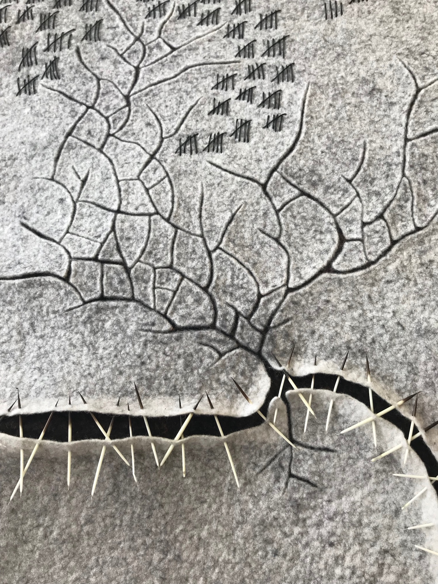 Merino wool, silk chiffon, embroidery thread, porcupine quills 35" x 25"
