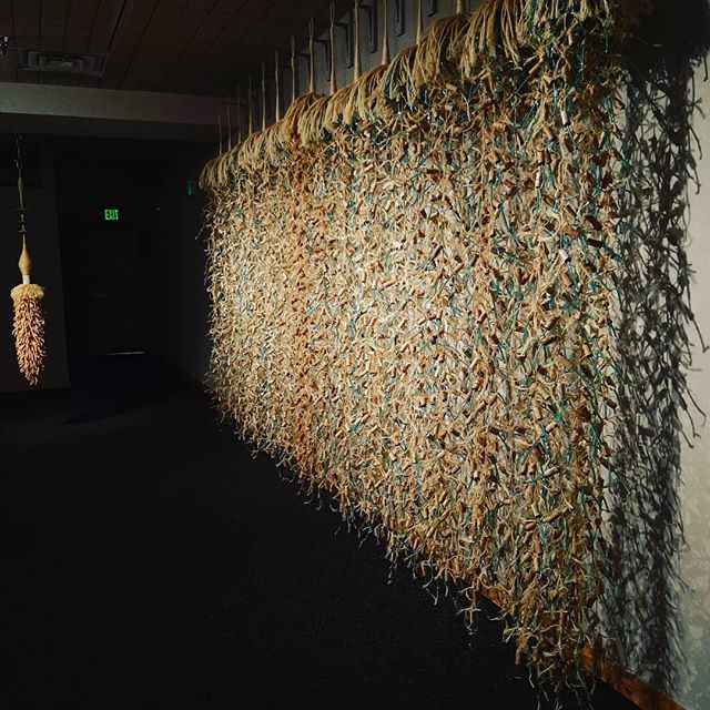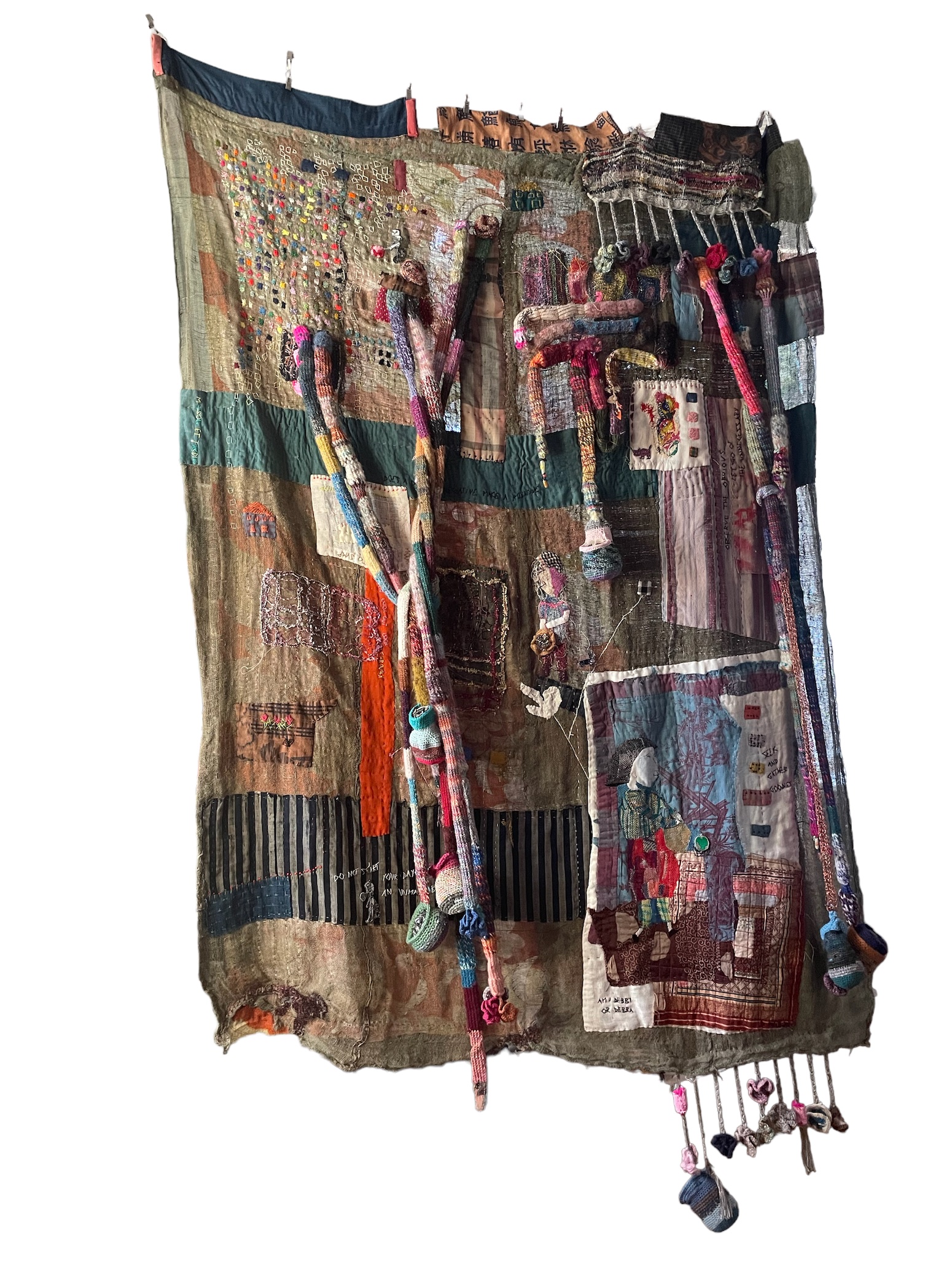 Machine woven repurposed fabrics, quilted, deer sinew cord, encaustic, oil paint, embroidery floss 48X72X2 inches