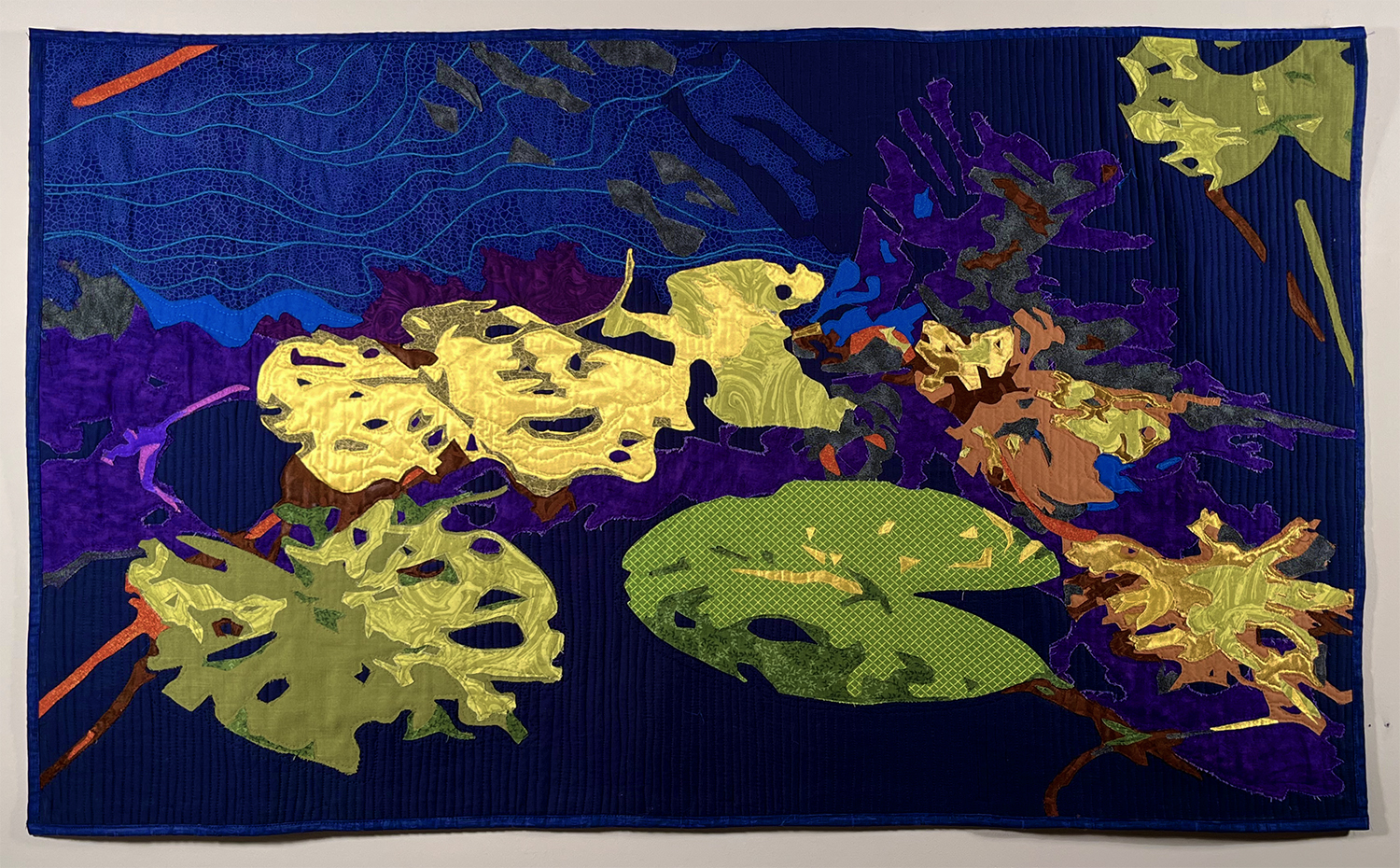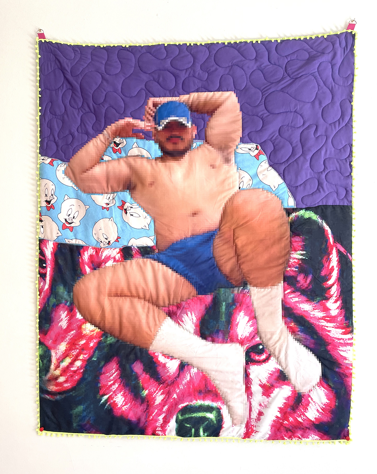 miscellaneous fabrics, dog leash, batting, thread 51"H x 37"W