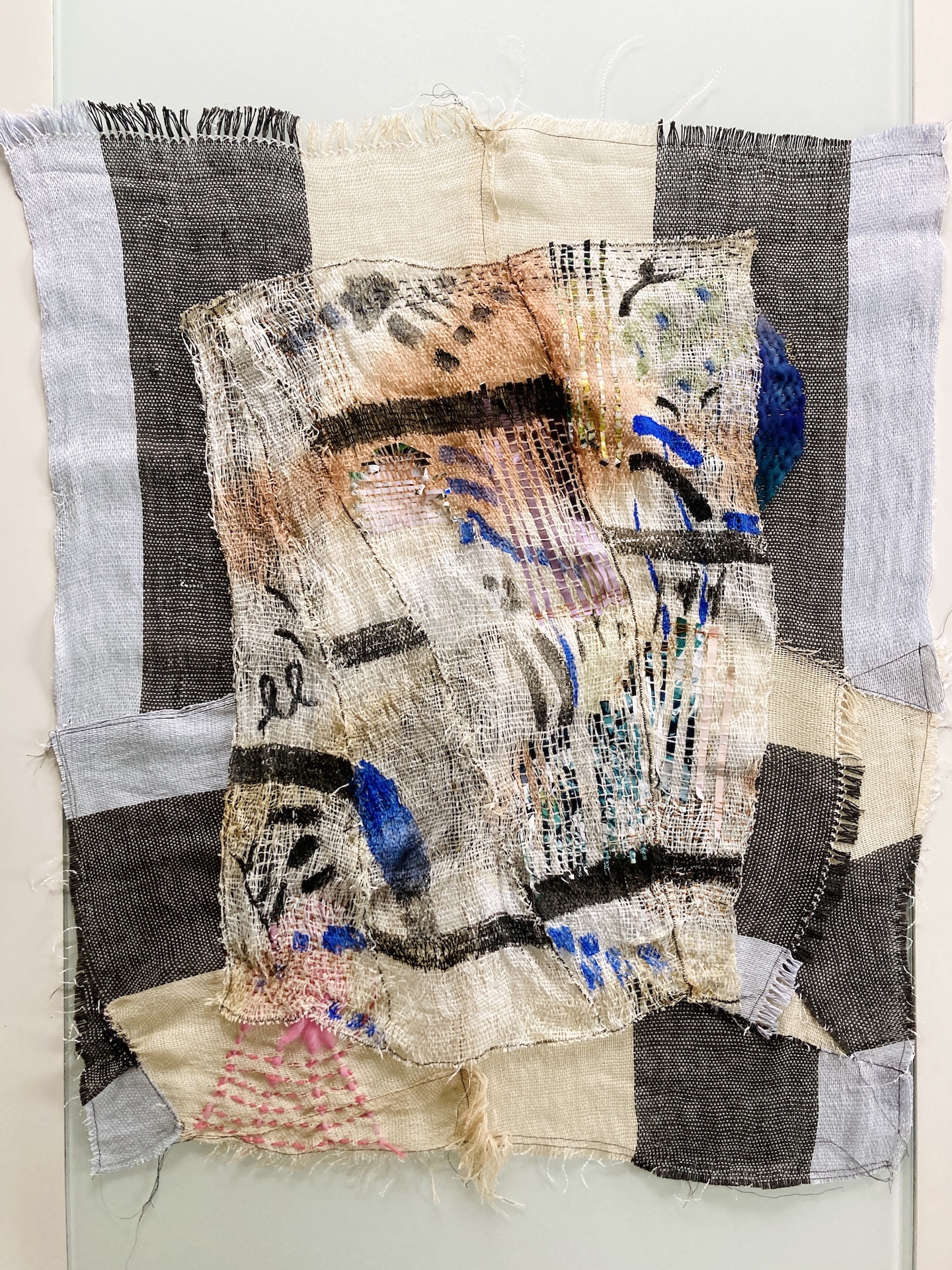 Indigo dyed linen, rayon, metallic and cotton threads 32" by 25"