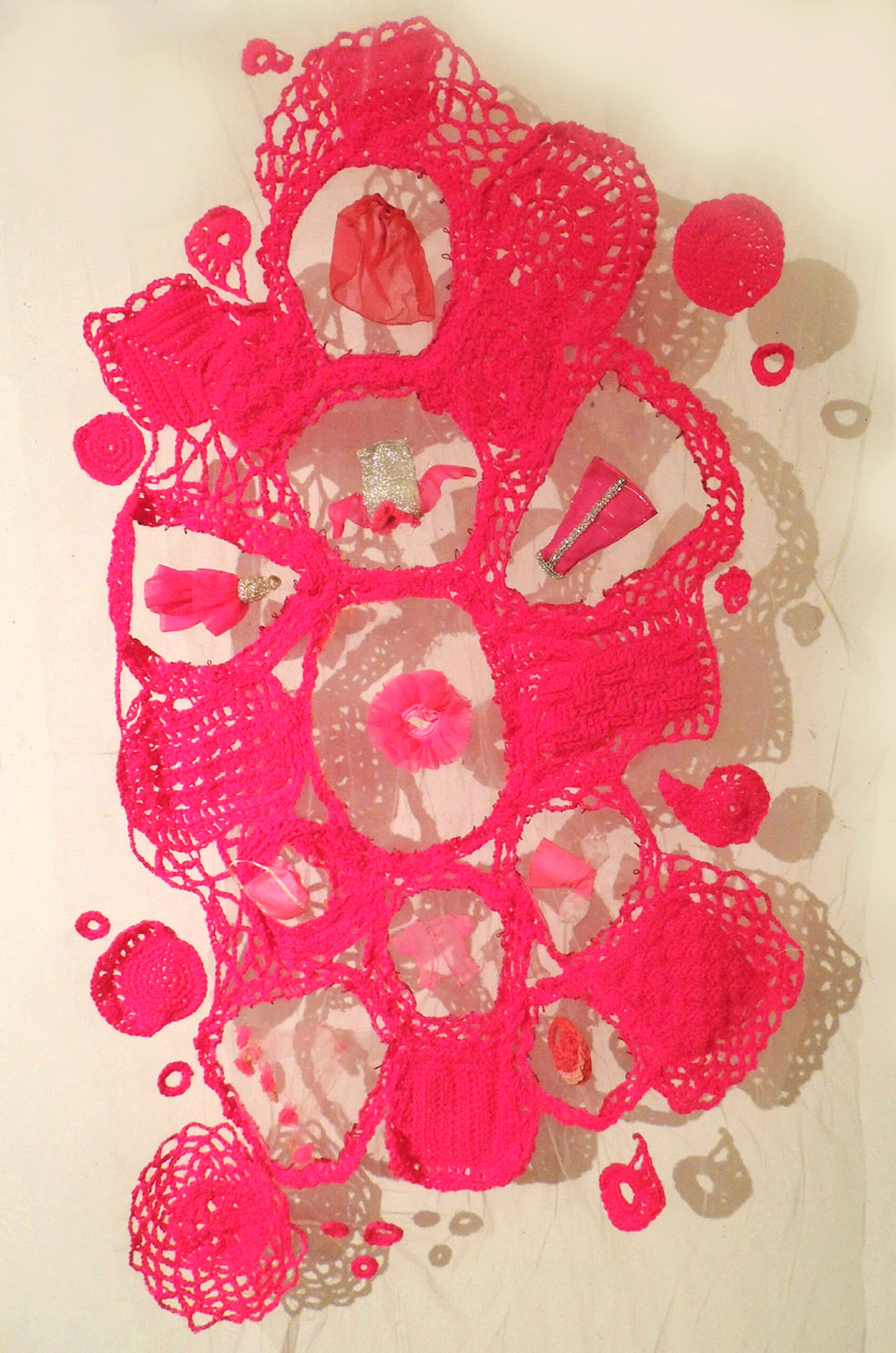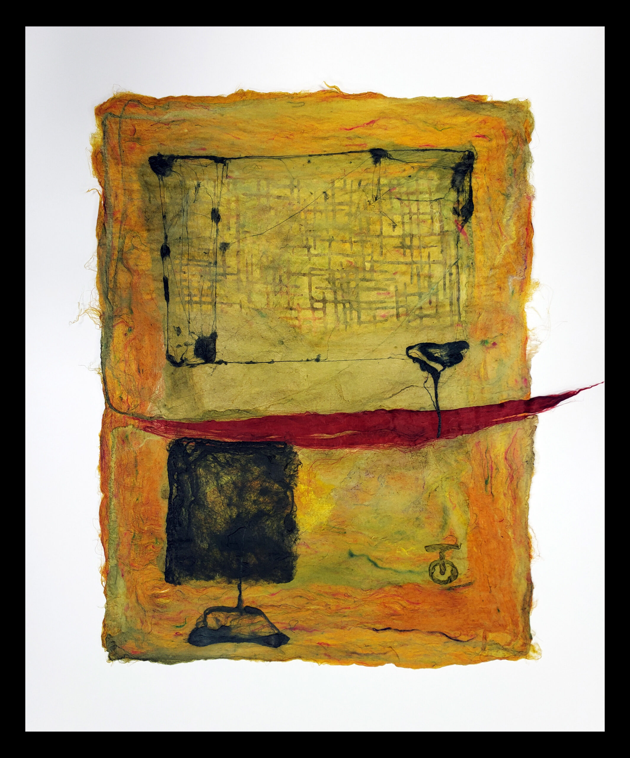 salvaged dressmaker’s pattern tissue,Georgia mill-end fiber and landscaping baling cord. Found objects metal stand. 21”H x19”W x 12” D