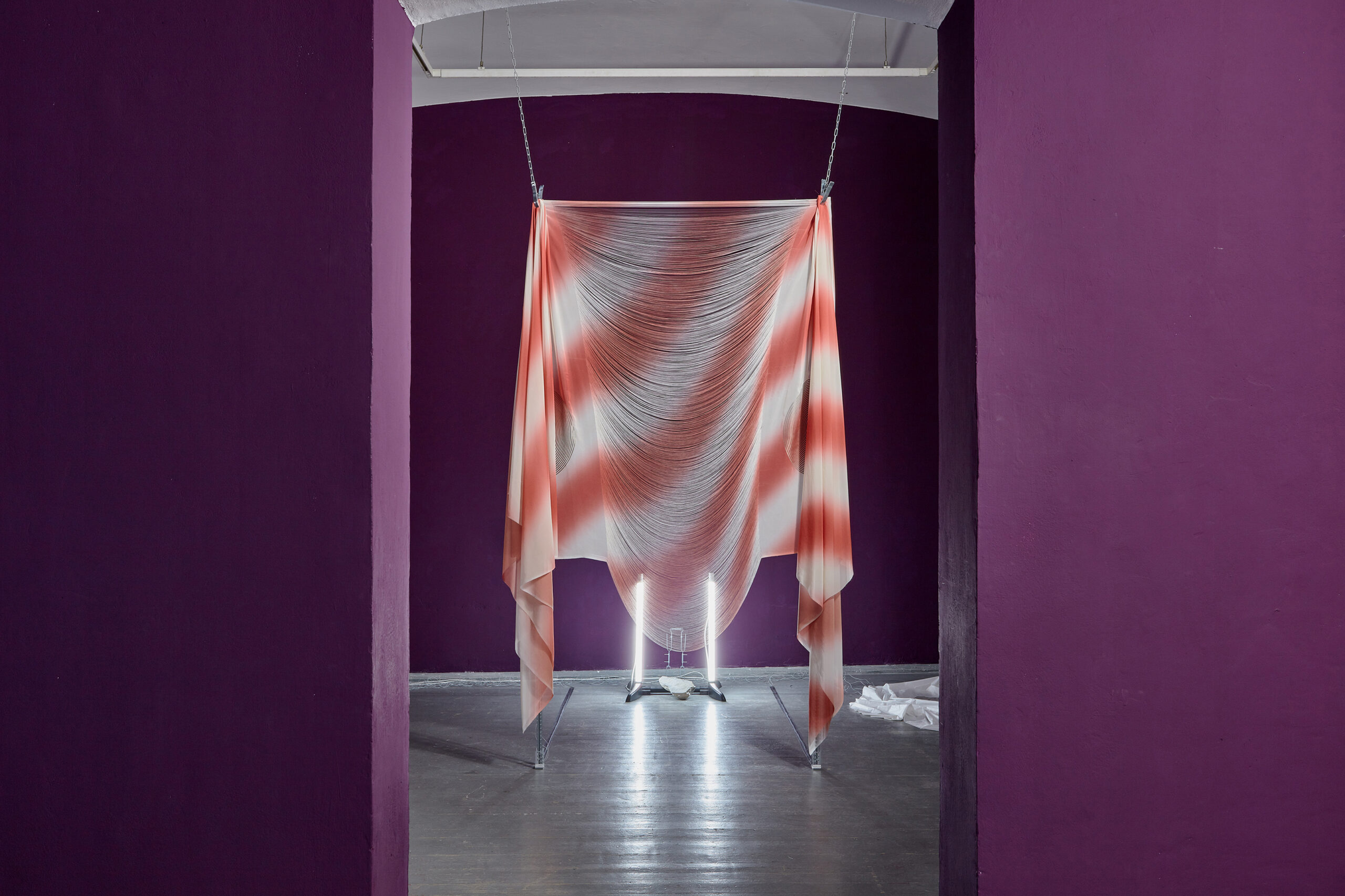 Linen, cotton, polyester thread, hand-dyed cotton thread 26 x 42 x 6 inches