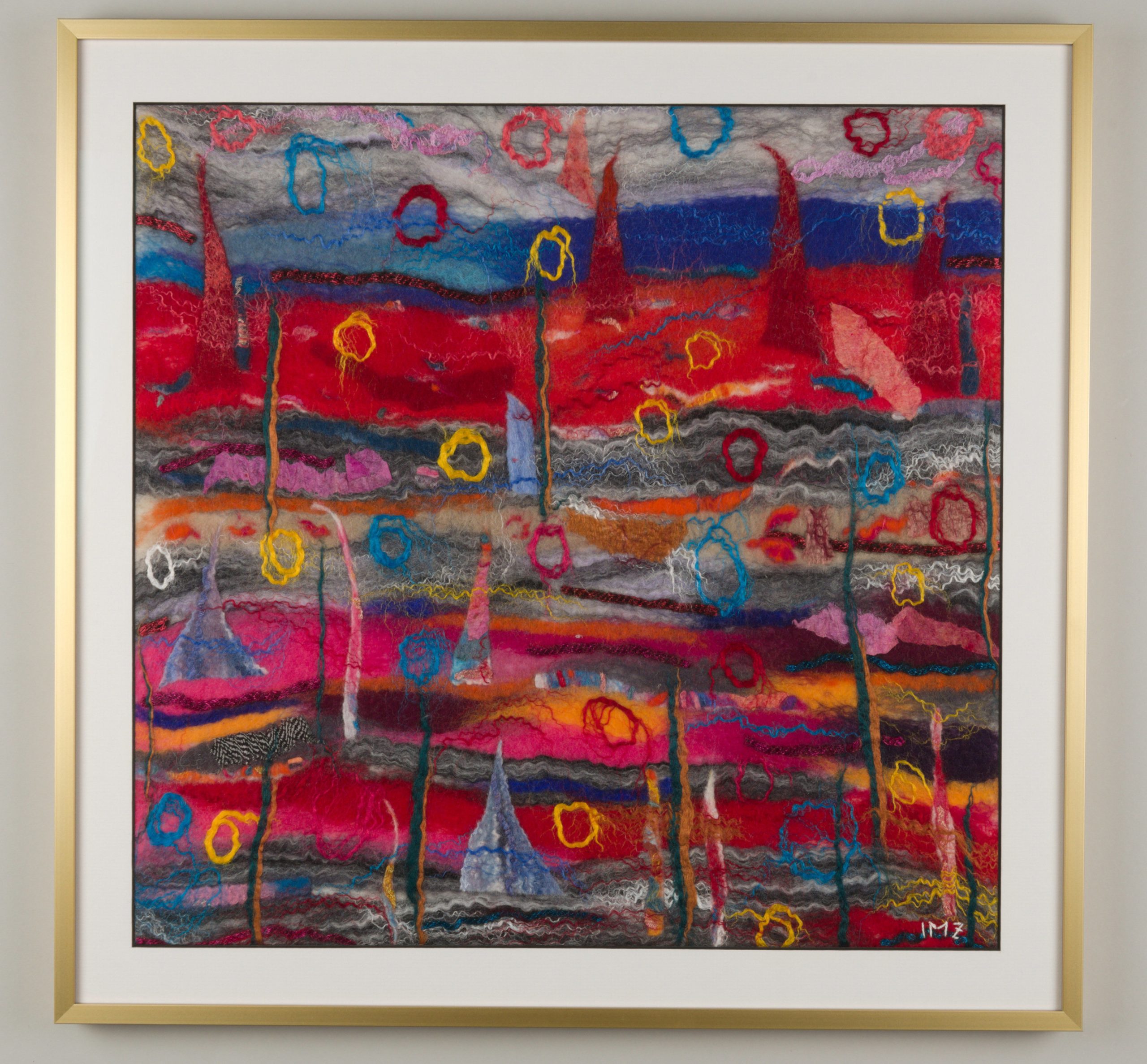 hand-dyed wool and hand-dyed cotton gauze nuno felted with machine and hand stitching 18 inches at widest point by 360 inches in length
