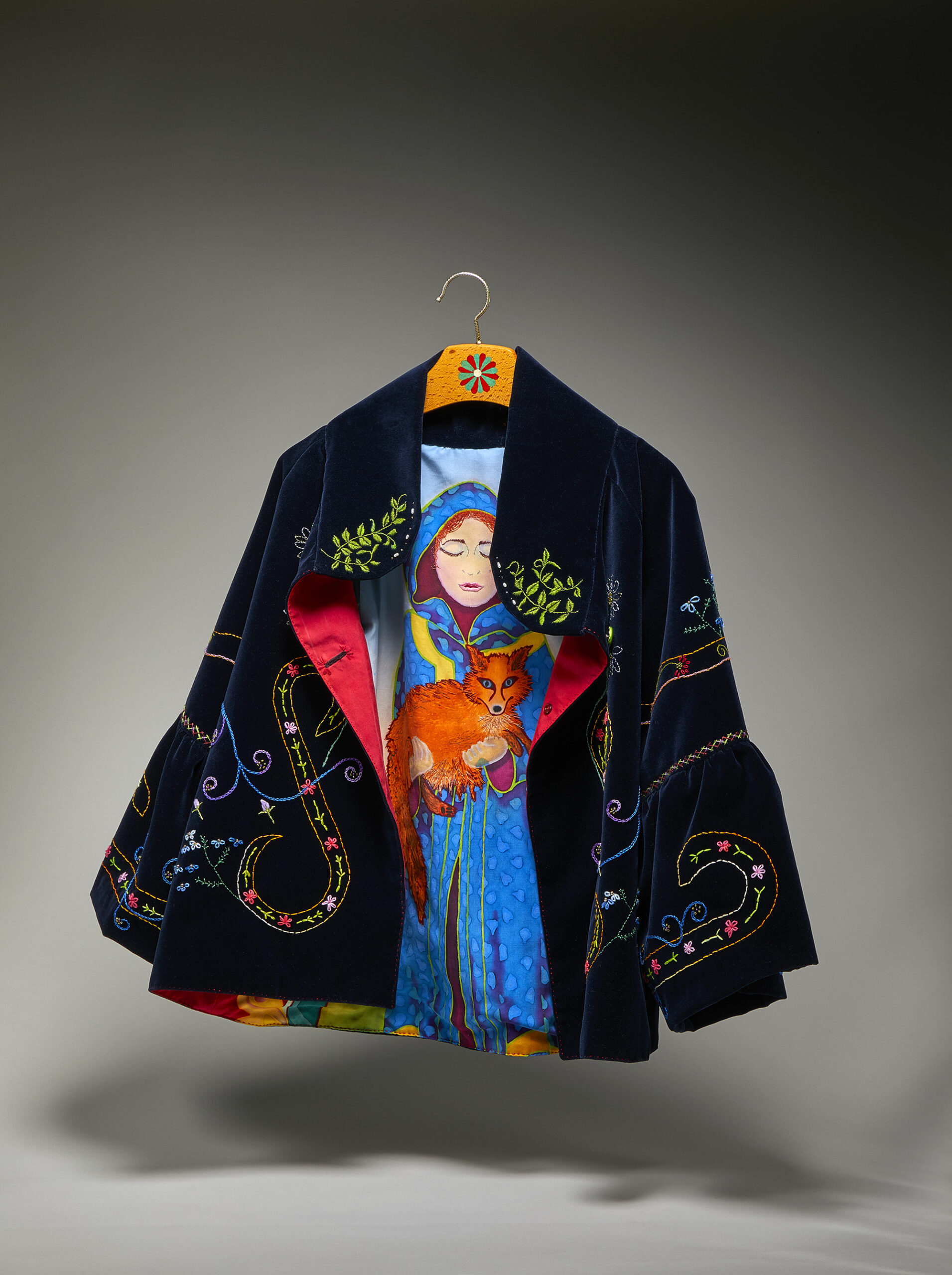 Fabric, thread, buttons, beads, corsage pins, felt, paper, on cardboard armature. 36" H x 12" D x 12" W