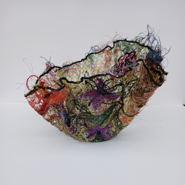 Painted and dyed cotton & silk, cotton & silk embroidery threads, repurposed antique upholstery fabric, found objects 30 x 18 x 1.5"