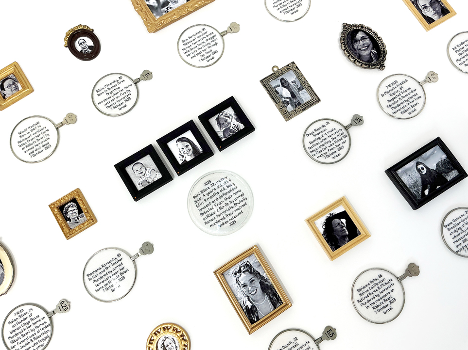 Cotton, silk threads, 24 vintage ophthalmic lenses, 26 miniature picture frames, photographs 66cm x 40cm x 1cm