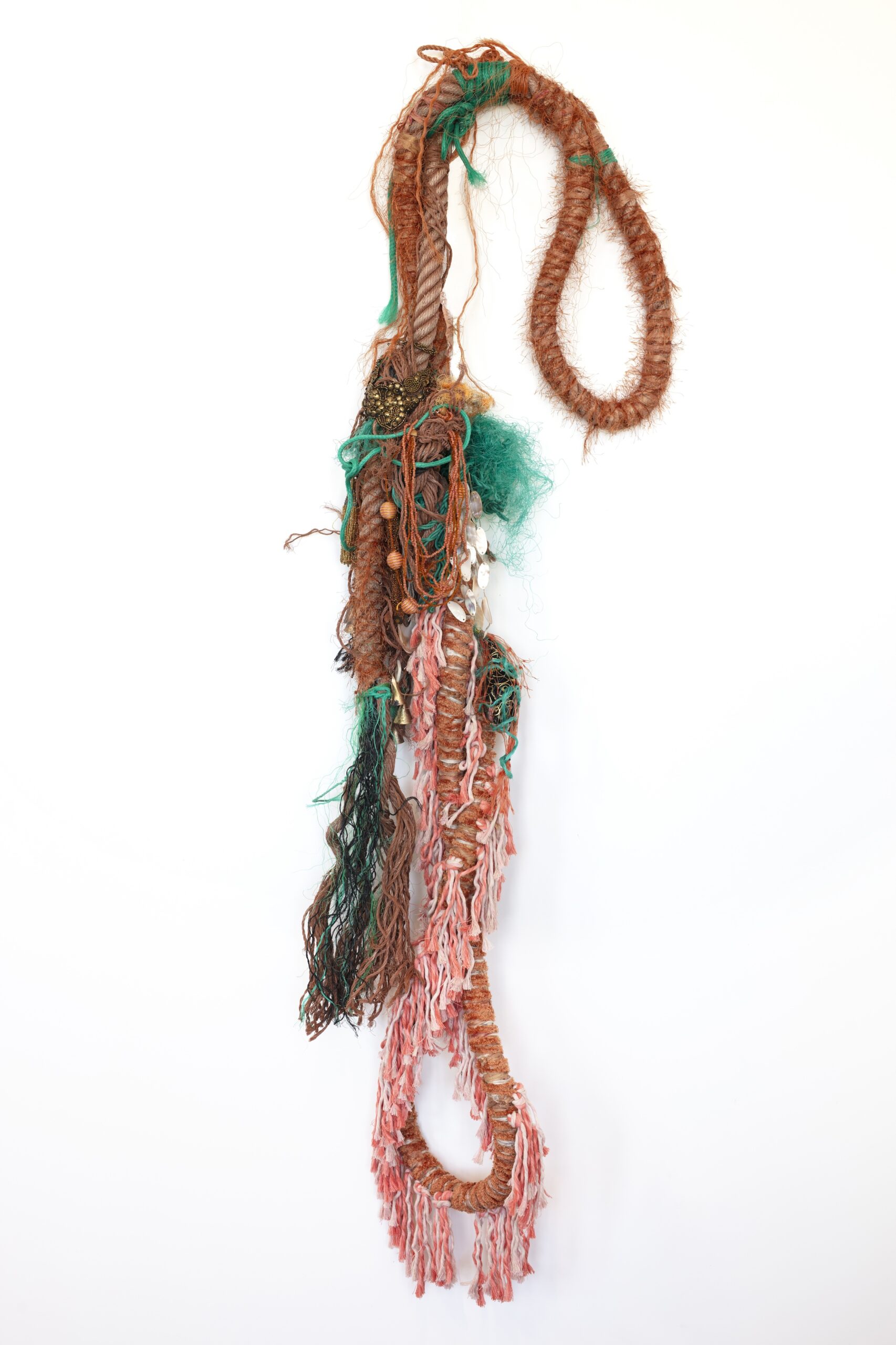 Recovered marine line, sea tumbled, woven and knotted with eyelash yarn, fabric, acrylic yarn , deconstructed line, beads, bells and shells. 66 x 24 x 10 in