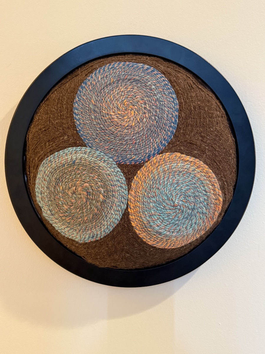 Hand spun wool yarn and vintage sewing thread on white cotton twill 12" diameter, 3" deep