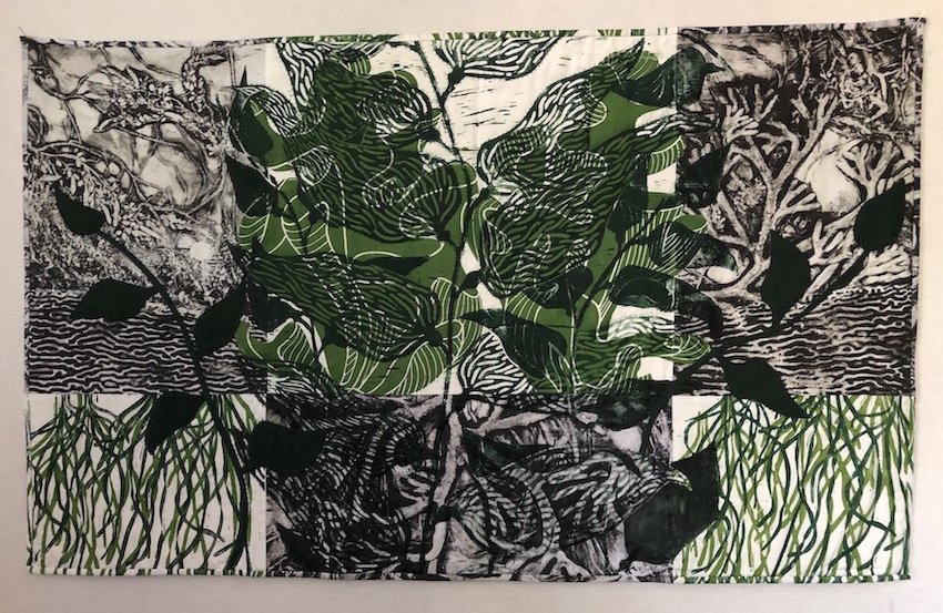 Hand dyed indigo and rusted cotton fabric, thread, ceramic buttons, pearl shell buttons, seed beads, wool 20" x 20" (51cm x 51cm)