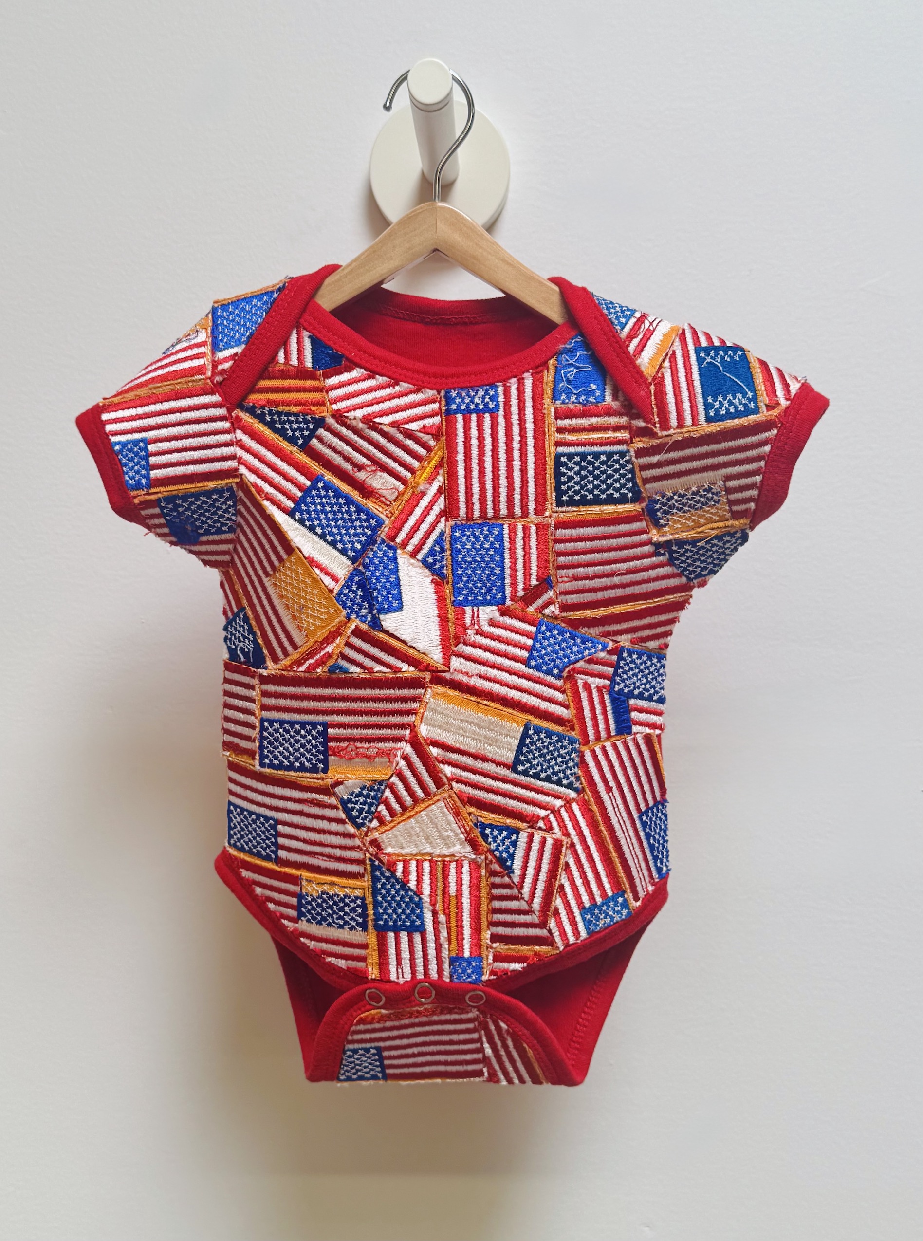 American flag patches, fabric, thread 17 x 13 x 1 in.