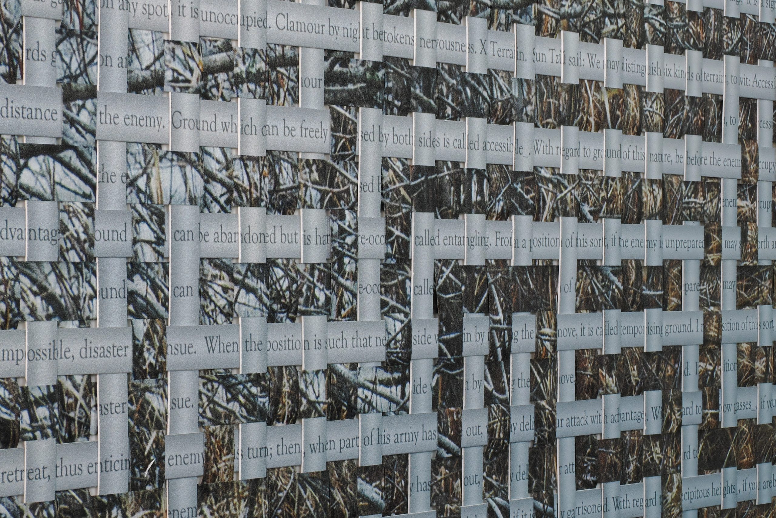 Inkjet prints of digitally altered text and photographs on Japanese and western papers, hand-cut into strips, hand weaving. 18 x 18". Text strips are 5/16" wide