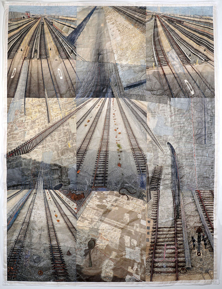 Sewn archival pigment prints on kozo paper, thread, found metal objects 70" x 55"