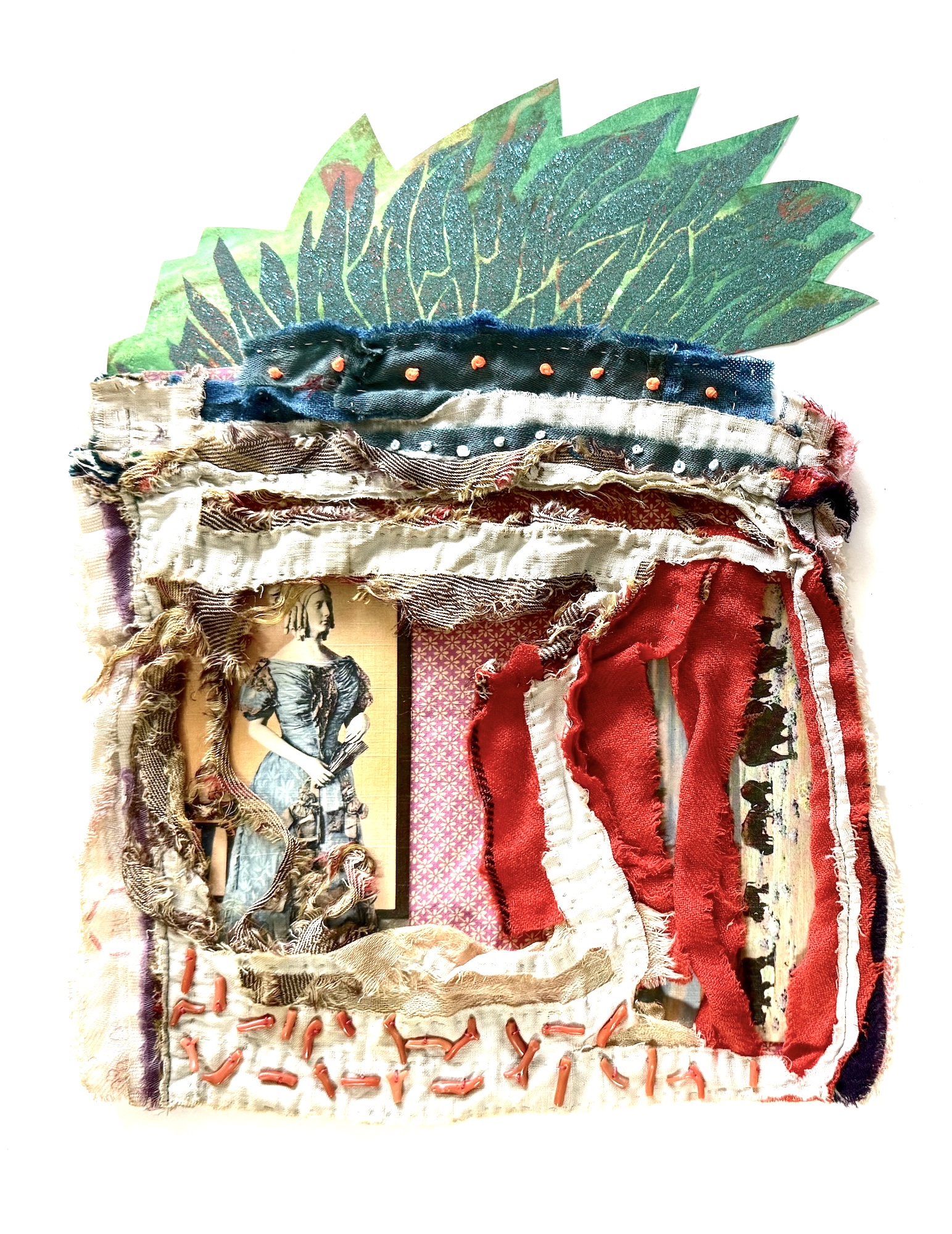 Acrylic, repurposed quilt, papers, threads, glitter, beads on 4ply mat board 14 x 11 in
