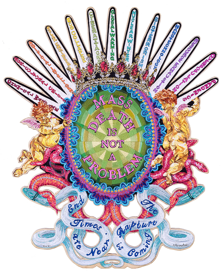 Mixed media. Hand sewn heat pressed plastics; embellished with screen-printing, glitter, beads and found objects. 25cm