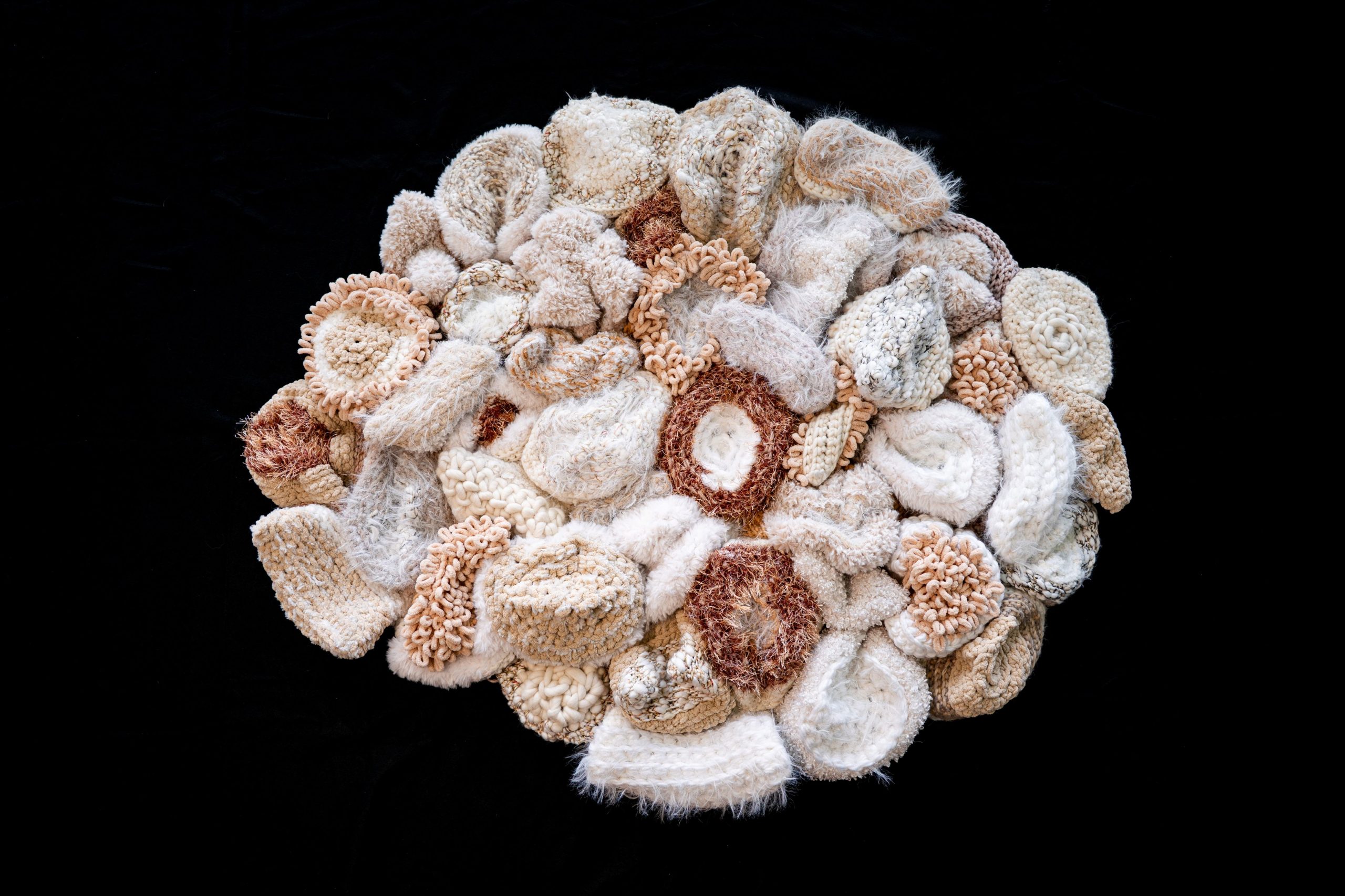 Wool, polyester, acrylic, polyamide yarns, upcycled copper (for the internal structure), 110cm x 100cm x 15cm (approximate)