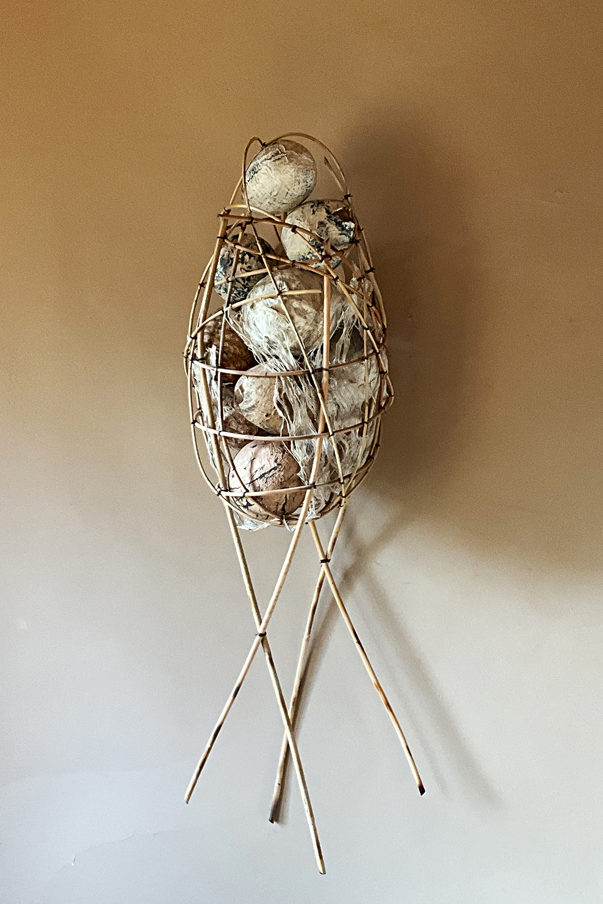 Rattan, cast handmade paper, indigo, kakishibu 38 x 16 x 13 inches
