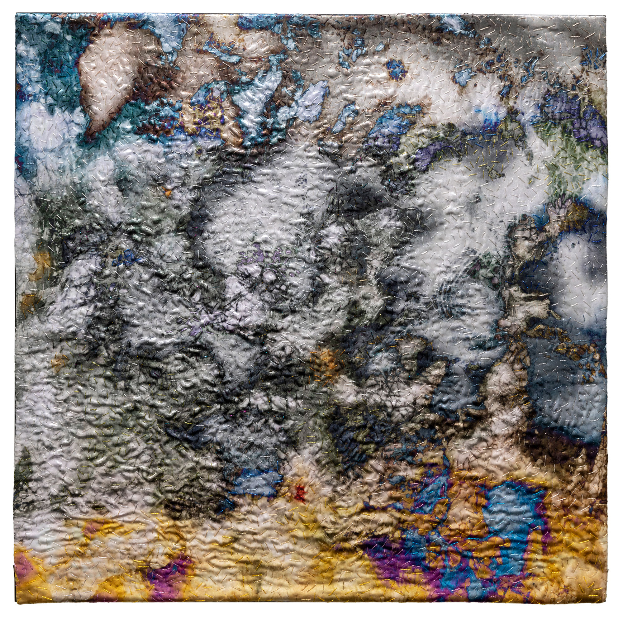 mono painted cotton, digital collage printed on satin, mounted on wood panel 20" x 20"