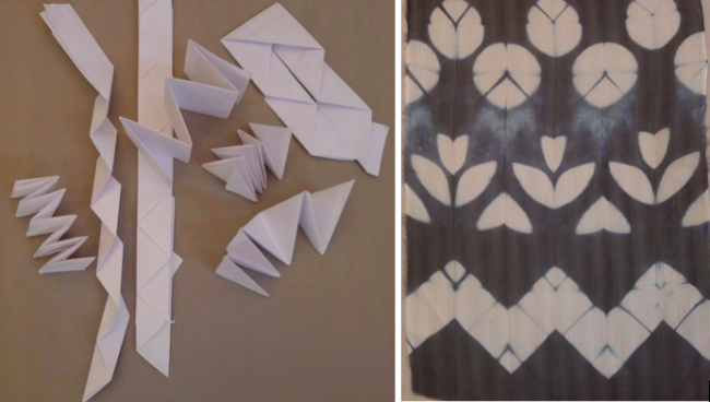 As always, I emphasize the characteristics of the substrate in planning and dyeing the cloth. I look at this through the eyes of a contemporary dyer, pushing the concepts behind the technique. The first steps of origami folding has been a source for inspiration, as well as found objects for blocks.
