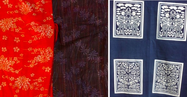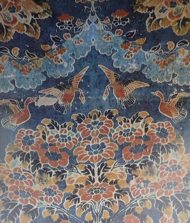 The most amazing examples were found in the Shoso-in in Nara, Japan. These ancient silk samples have pictorial images of animals, birds and flowers in multiple colors. The carving is like a maze – about ¼” deep – in wooden blocks. Holes are drilled in strategic spots to allow the dye to flow into the channels. Small wooden plugs could block certain areas so different colors could be used. Later the kyokechi concept was used in Central Asia, China, and Japan to produce fabric in a production mode. This process is called jiaxie in China and beni (safflower dye) -itajime in Japan.