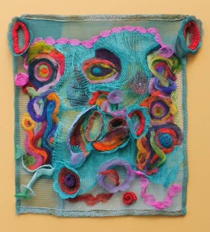 Kerler_WireKnitZ_JDunnewold_16“I loved pulling it apart and stretching it to create forms that lifted away from the surface. The color range made it easy to match the hand painted and screened background colors, so the dimension was a neat effect,” she observed.
