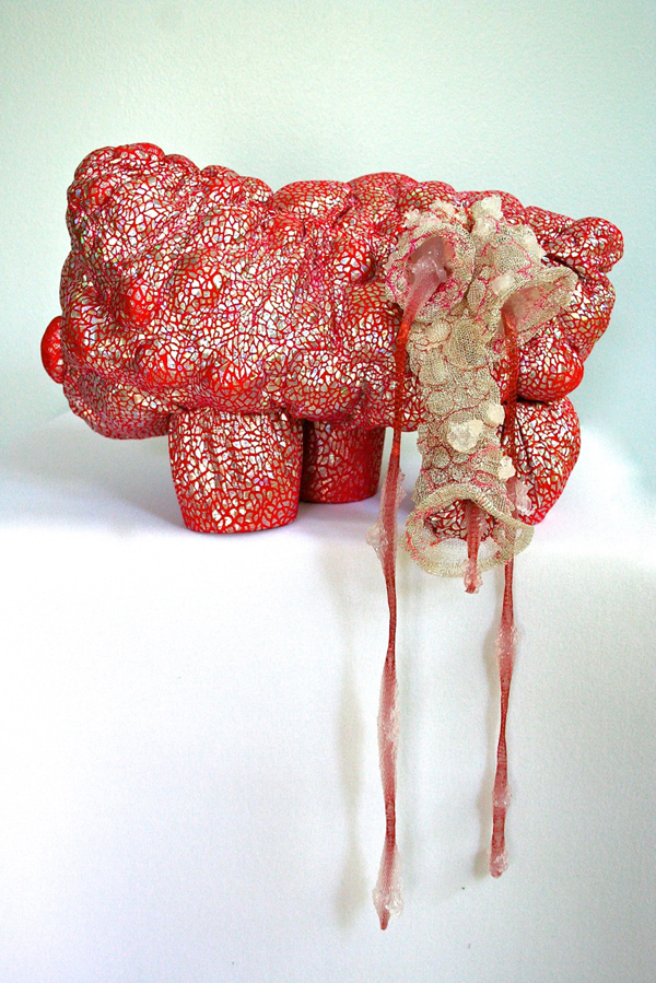 In Disco Metastasis Rich’s sculptural experimentation includes injecting silicone then free-motion stitching into the WireKnitZ.